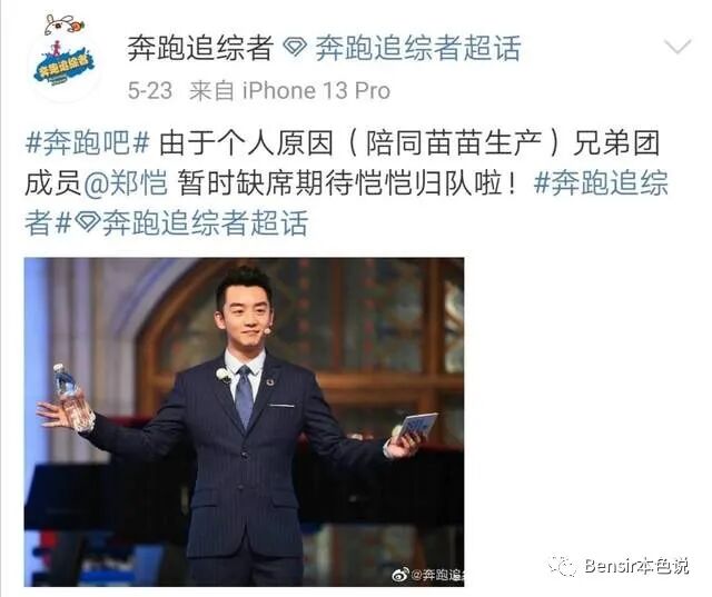 5月26日,《奔跑吧》节目组发文通知,郑恺缺席新一季节目的录制,因为他去陪产了。