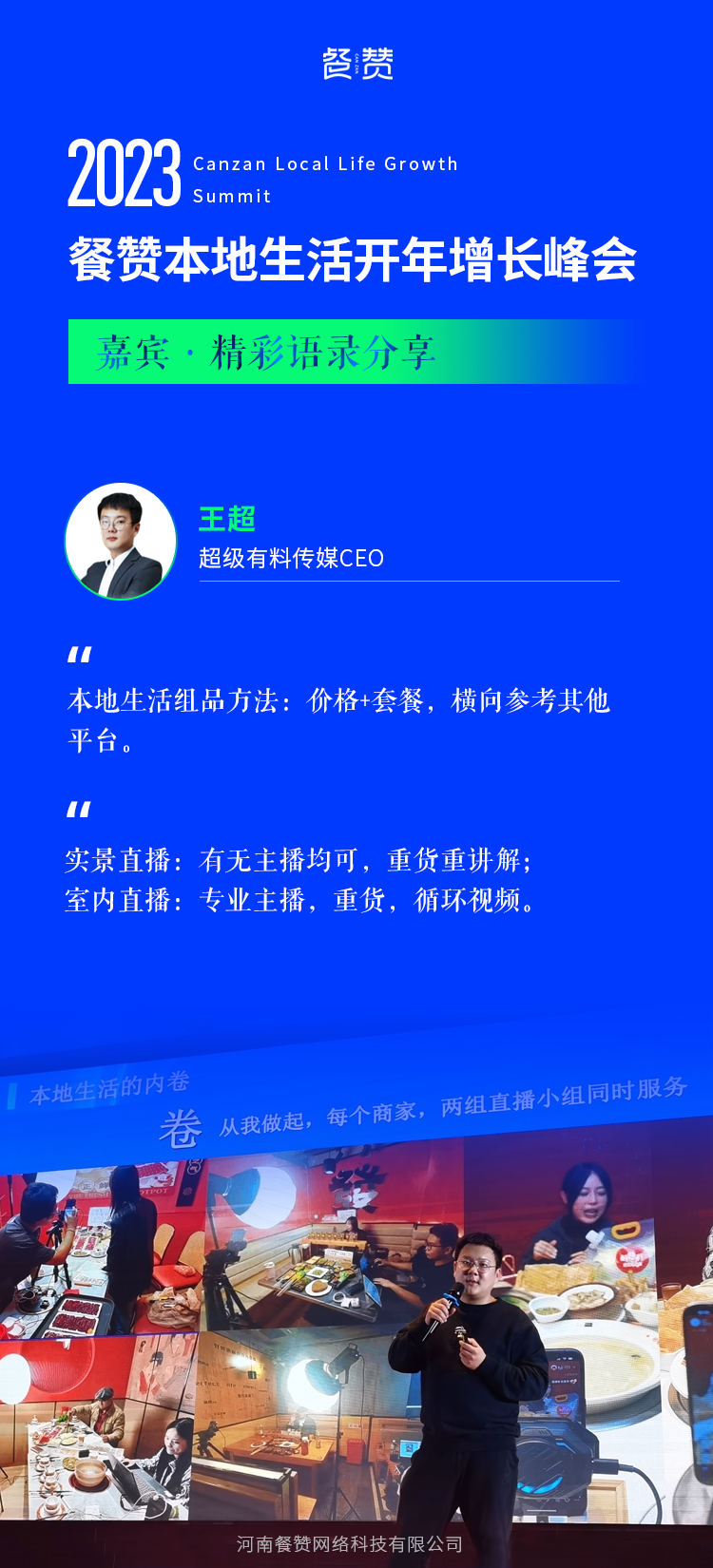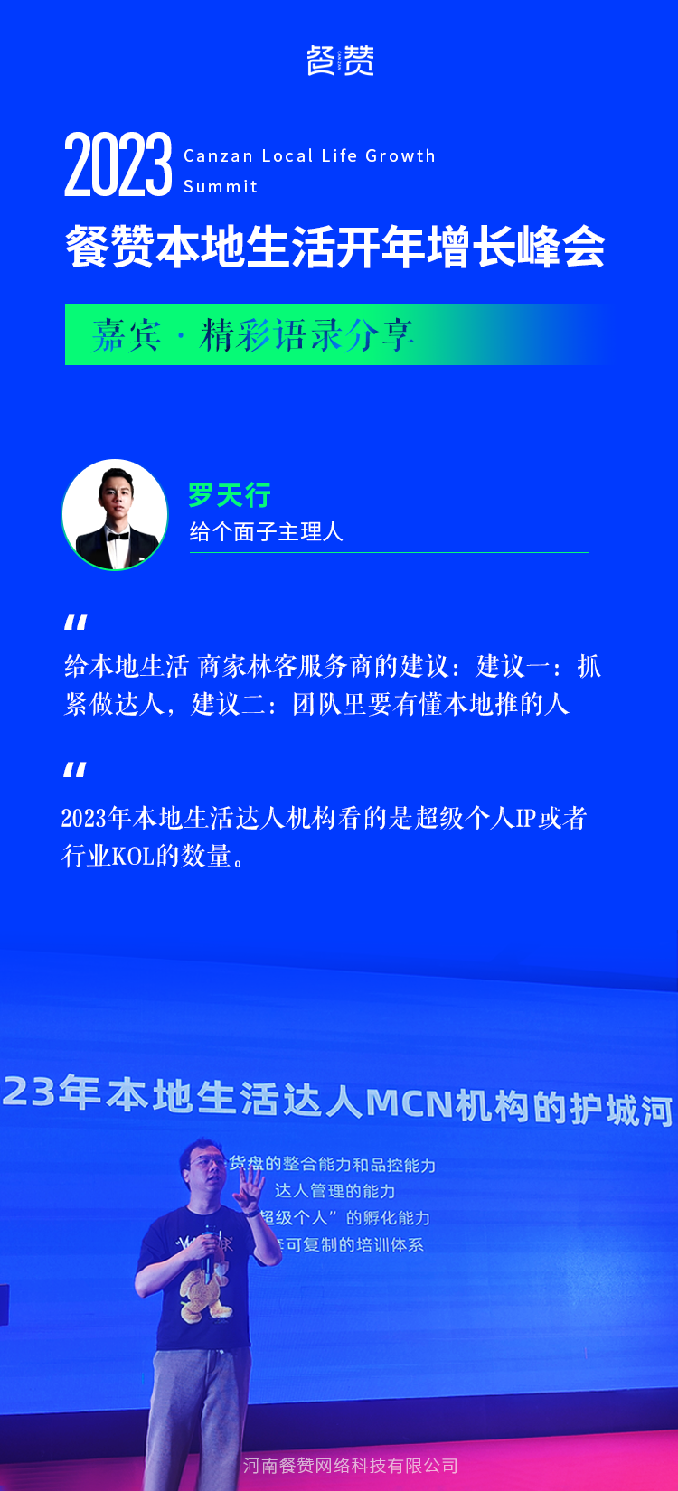 餐赞CEO陈淼、餐赞市场总监何文、餐赞运营总监刘辰、餐赞运营副总监高尚、餐赞学院院长李大鑫、给个面子主理人罗天行以及超级有料传媒CEO王超出席了20日的大会并各自分享了关于本地生活的行业认知和运营干货。