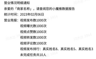 更贴心的是,在小魔推助手每日的专属数据统计推送中,也会通知管理者每日视频发布排行和未完成任务的情况,管理者从手机微信就可以直接收到业绩消息,非常方便快捷,高效省时。