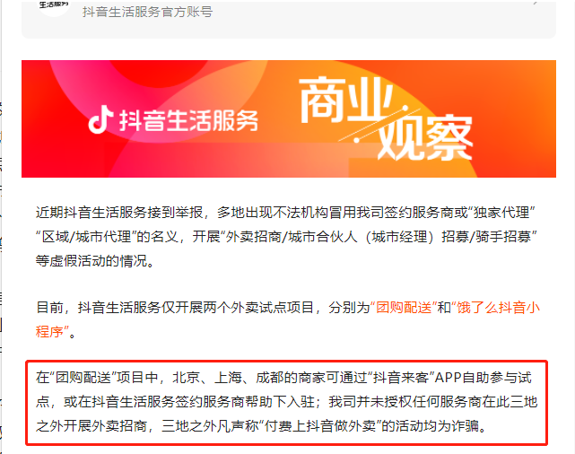 截止目前,抖音团购配送业务仍在北京、上海、成都三个城市试点中,没有任何服务商有权限在此三地之外开展外卖招商,三地之外凡声称“付费上抖音做外卖”的活动均为诈骗。