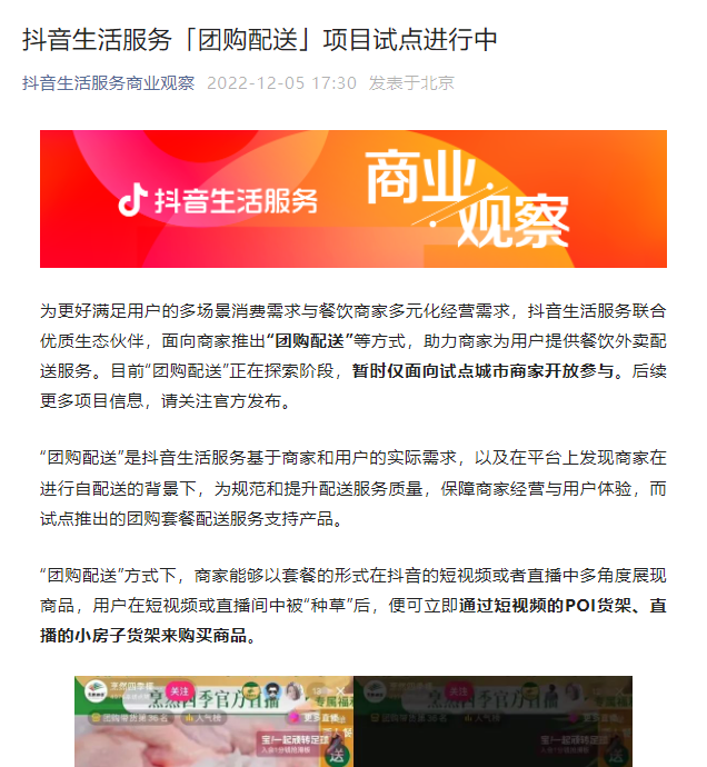 2022年12月5日,“抖音生活服务商业观察”发文称,为更好满足用户的多场景消费需求与餐饮商家多元化经营需求,抖音生活服务联合优质生态伙伴,面向商家推出“团购配送”等方式,助力商家为用户提供餐饮外卖配送服务。