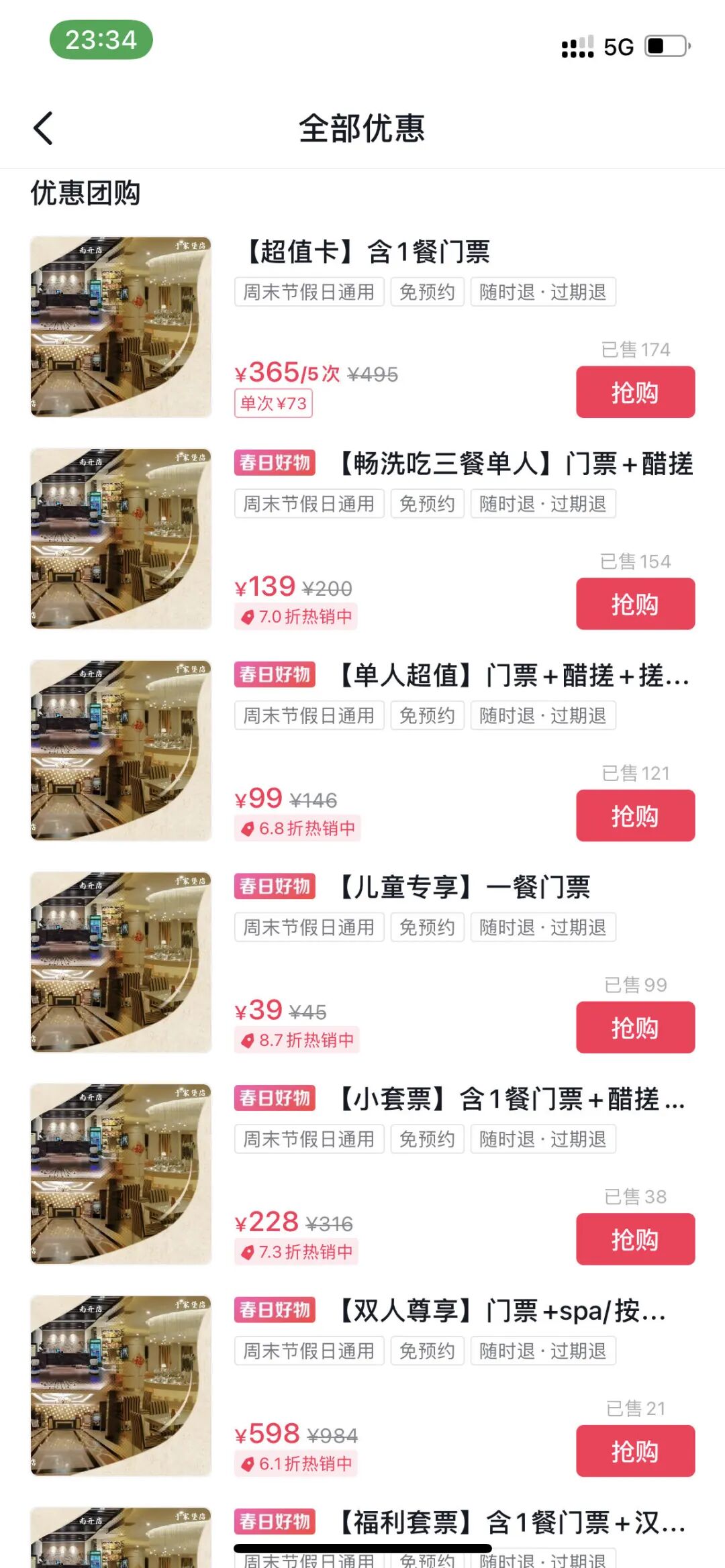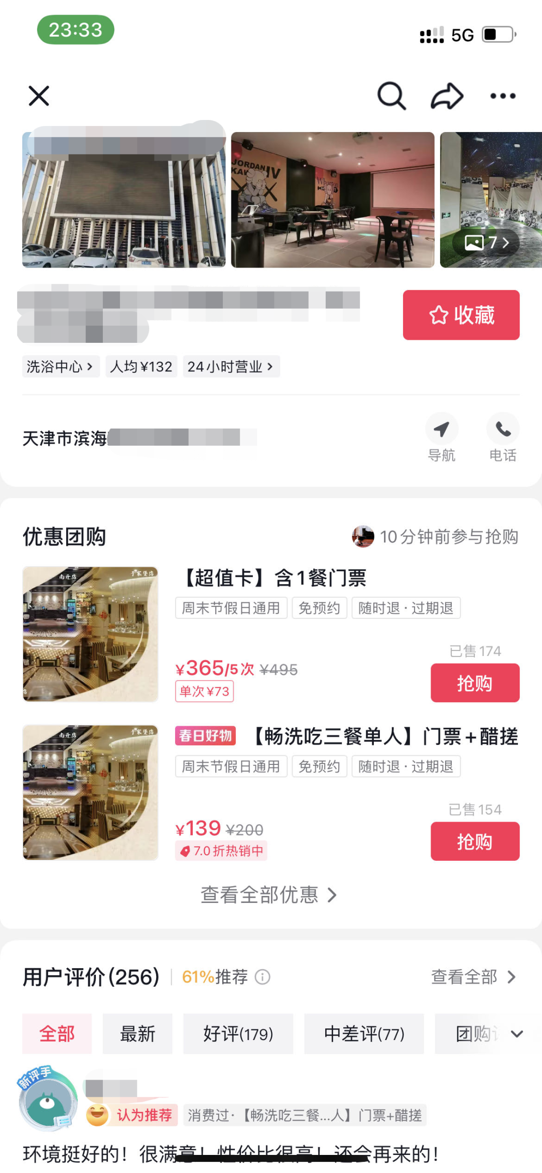 商家是天津的连锁洗浴商家,共有3个门店,是包含了洗浴、自助餐、休闲娱乐等多功能的洗浴休闲广场。