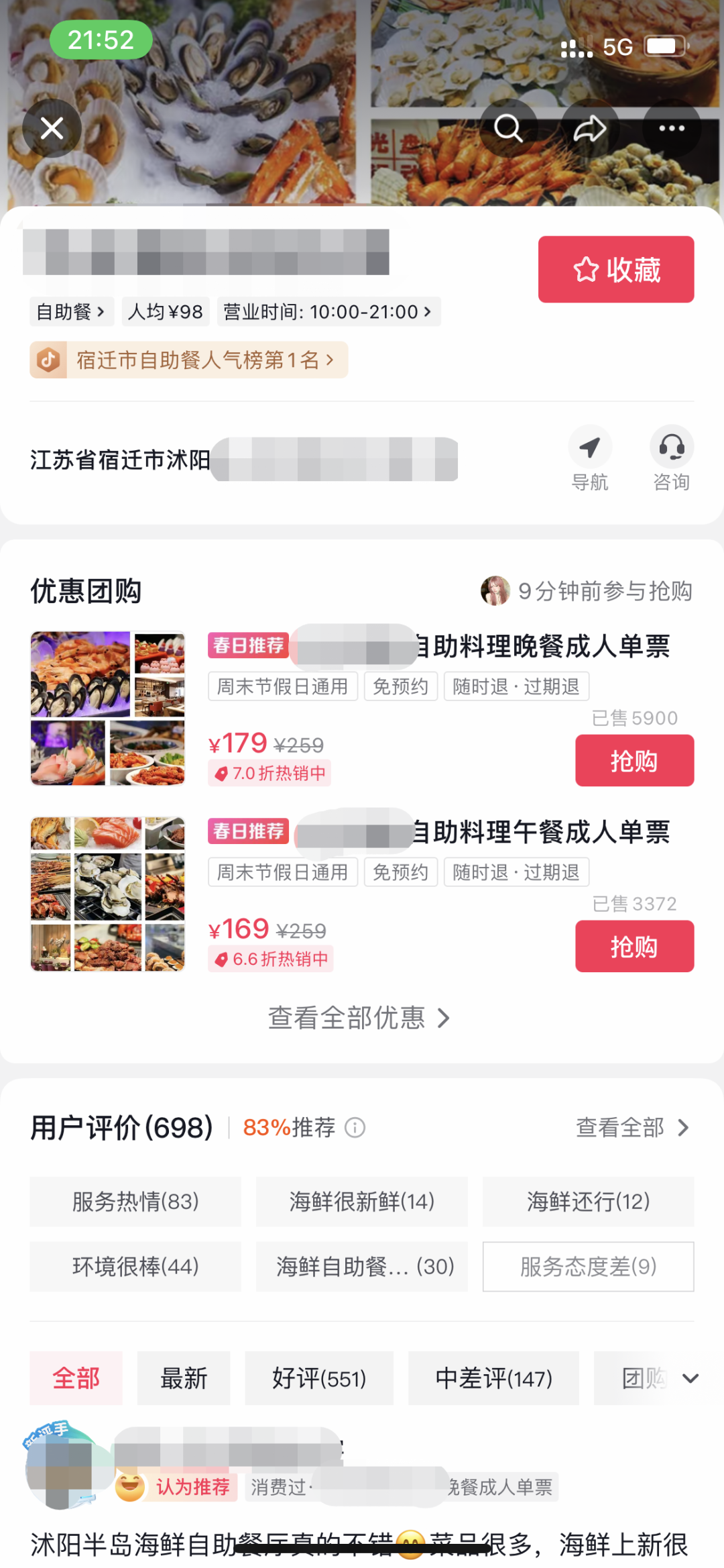 商家是宿迁的一个海鲜自助单店,在春节开始前半个月做活动进行了集中推广,现在日常是每天做直播,周三和周五还会有达人短视频进行推广。