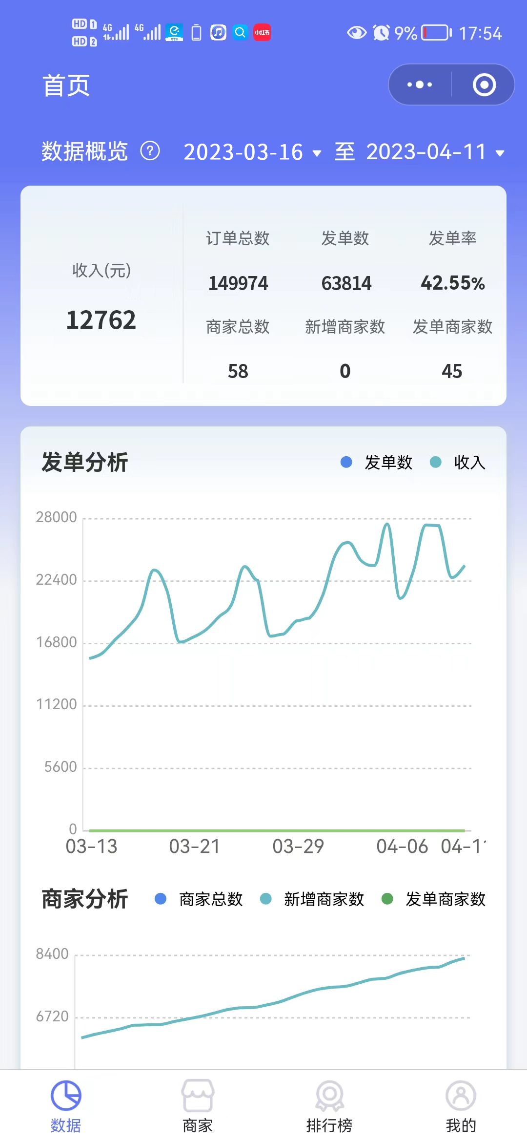 统计时间为3月16日-4月10日,将近1个月的时间,这位合伙人共服务赋能了58个商家,其中通过船到有发单行为的商家是45家,总发单数据为63814单,因此合伙人发单收益为:63814单*0.2(发单服务费/单)元=12762元。