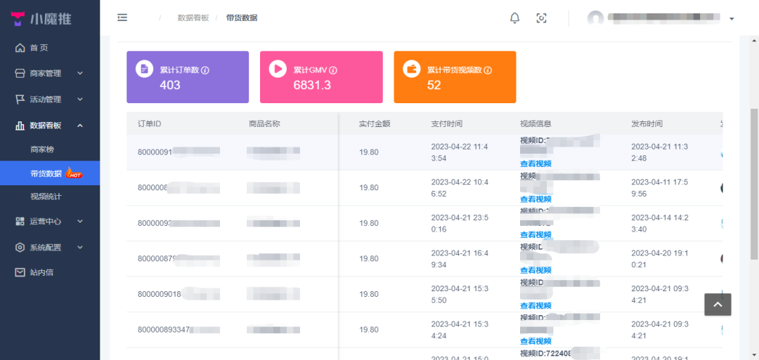 小魔推员工矩阵管理功能,能够对企业或商家的员工扫码发视频带货情况进行管理。