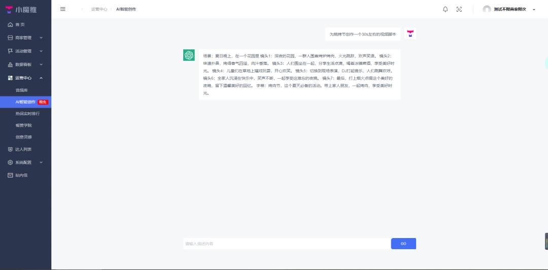 小魔推的【AI智能创作】功能能够创作生成创意文案、视频脚本、创意标题、活动话题、拍摄思路,助力合作伙伴和商家更轻松地产出更多优质视频内容。