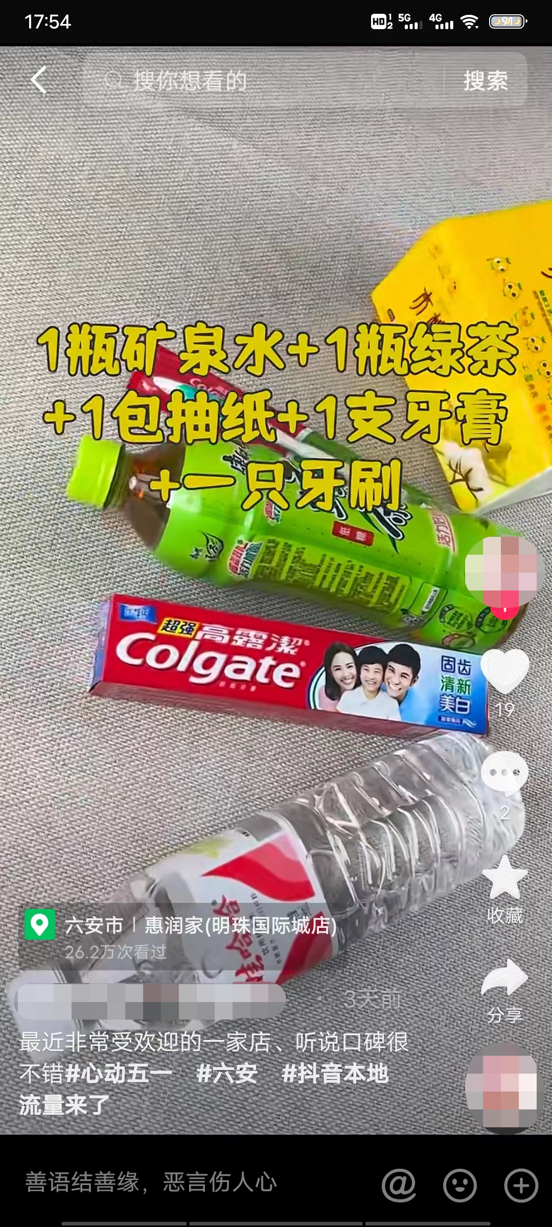 今天我们就来介绍一个在五一假期做引流活动的【商超】案例,是六安市的一个超市——惠润家(明珠国际城店),通过小魔推进行曝光引流获客,并拉动上架的团购套餐内容。