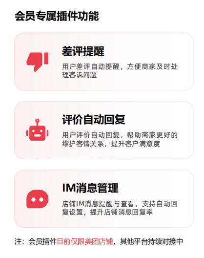 其中差评提醒、评价自动回复、IM消息管理属于会员专属插件功能,目前仅限美团店铺,其他平台持续对接中。