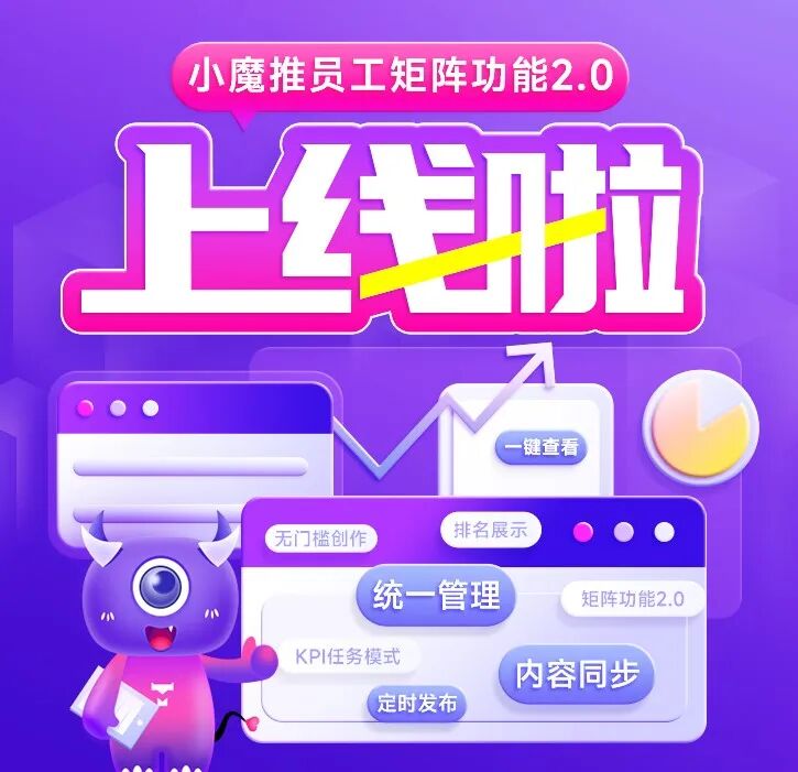 小魔推【员工矩阵2.0】能够实现多账号的统一管理,视频内容一键发布,员工发布业绩统计,以及视频数据分析。