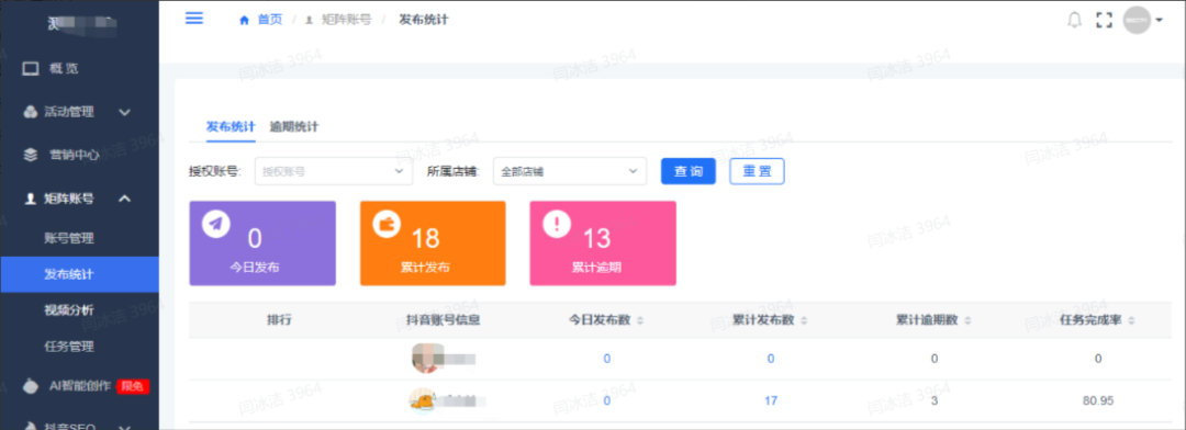 视频发布完成后,可在“矩阵账号”-“发布统计”页面查看员工整体发布视频的情况,可查看当日发布量、累计发布量、累计逾期量的数据,对员工的业绩情况了如指掌。