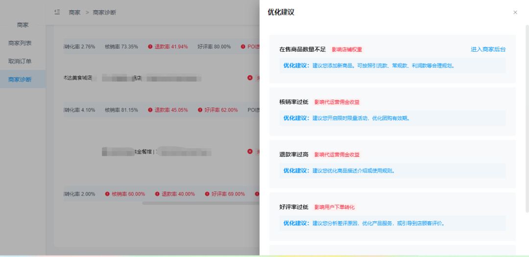 通过【商家诊断】功能,做好商家服务,一键诊断合作商家,能够直接定位问题,提供策略,实现高效优化。