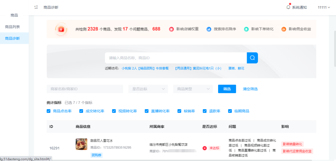 商品诊断的数据概览会直接展示临期商品、低点击率商品以及低成交率商品的数据,能让运营同学对商品情况有直接了解,及时进行调整