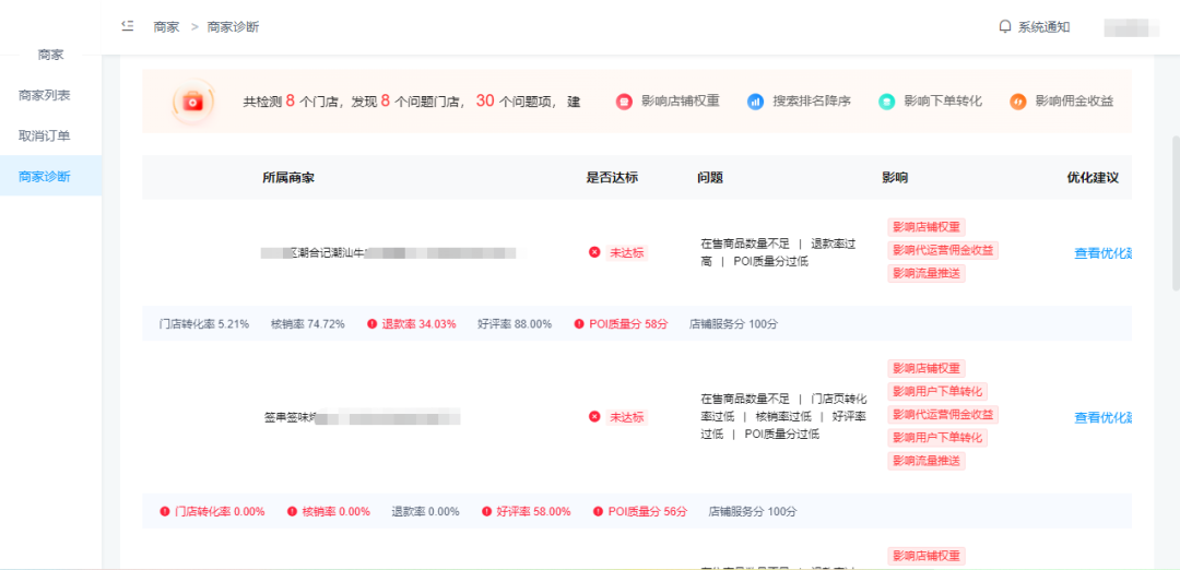 通过商家诊断功能,可在门店明细中,搜索商家名称进行筛选诊断,也能同时多选进行诊断,诊断结果会给出是否达标,存在的问题,相对应的影响有哪些,以及该如何进行修改优化,便于运营同学按照建议进行修改,从而帮助门店获得更好的转化效果。
