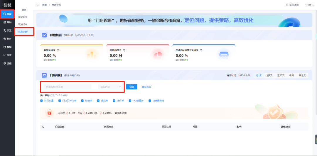 餐赞团购服务上线【商家诊断】功能,在“商家”模块-“商家诊断”中可使用此功能。