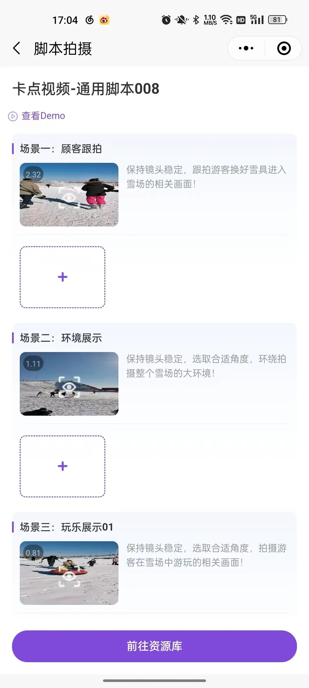 分场景进行拍摄,且对每个场景下的拍摄内容进行了详解,按照模板进行拍摄即可,上传素材库后即可生成优质视频内容。
