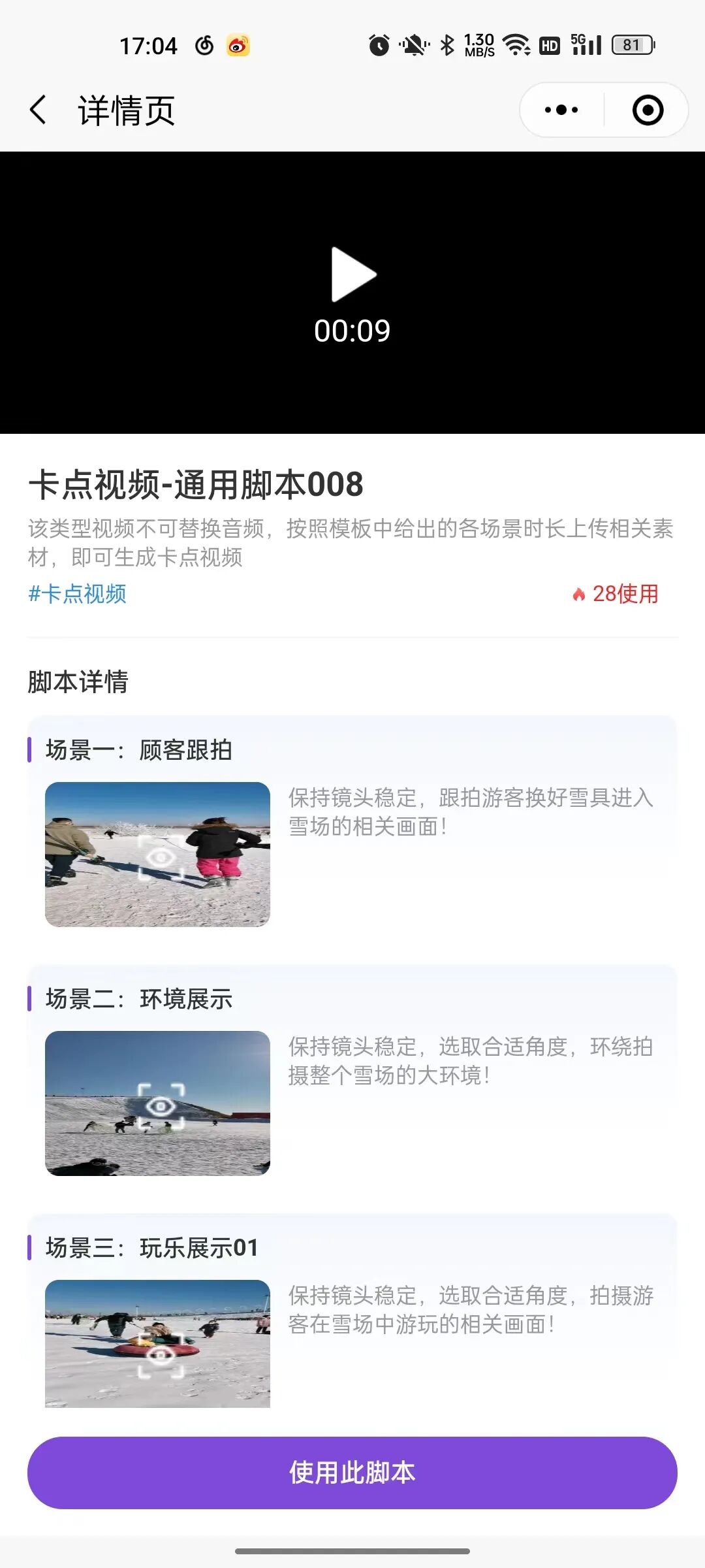 手机端后台创作脚本内选择脚本模板,清晰展示如何进行拍摄,对于拍摄门槛较低,分段场景拍摄教学十分详细,解决不会拍摄的困扰。