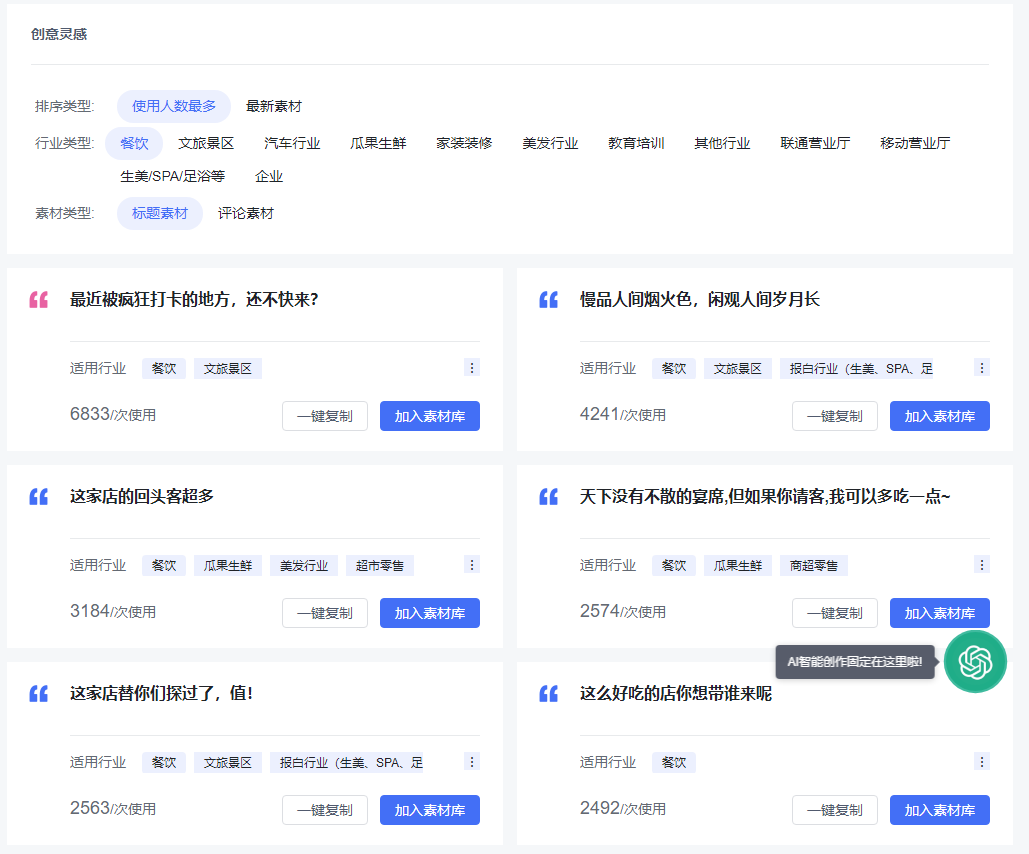 另外,小魔推的创意灵感库内也有大量的标题素材和评论素材,可以在已有的素材库内进行选择,能够按照行业分类进行查找使用。