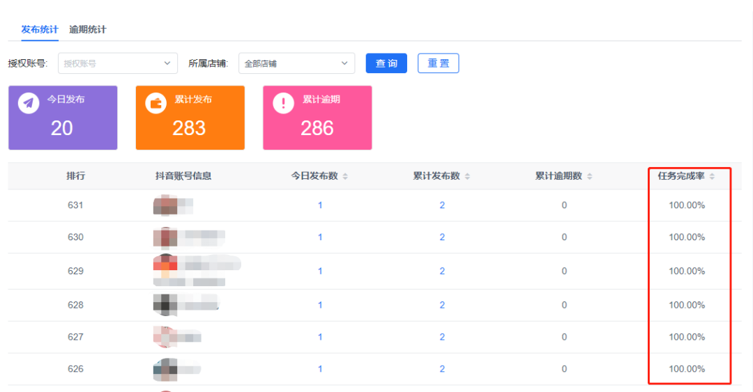 矩阵账号管理功能支持数据一键查看,所以商家的员工账号当日发布视频的数量、累计发布数量,以及任务完成率都清晰可见,可以根据数据考核KPI及进行奖金发放。