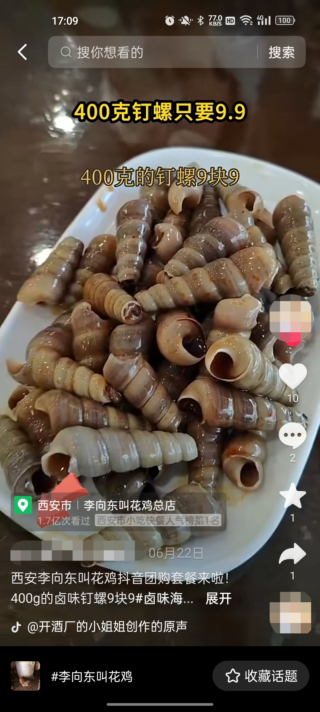 合作伙伴为【李向东叫花鸡总店】找了团购达人来参与小魔推的扫码发视频活动,借助达人的粉丝影响力为商家造势。