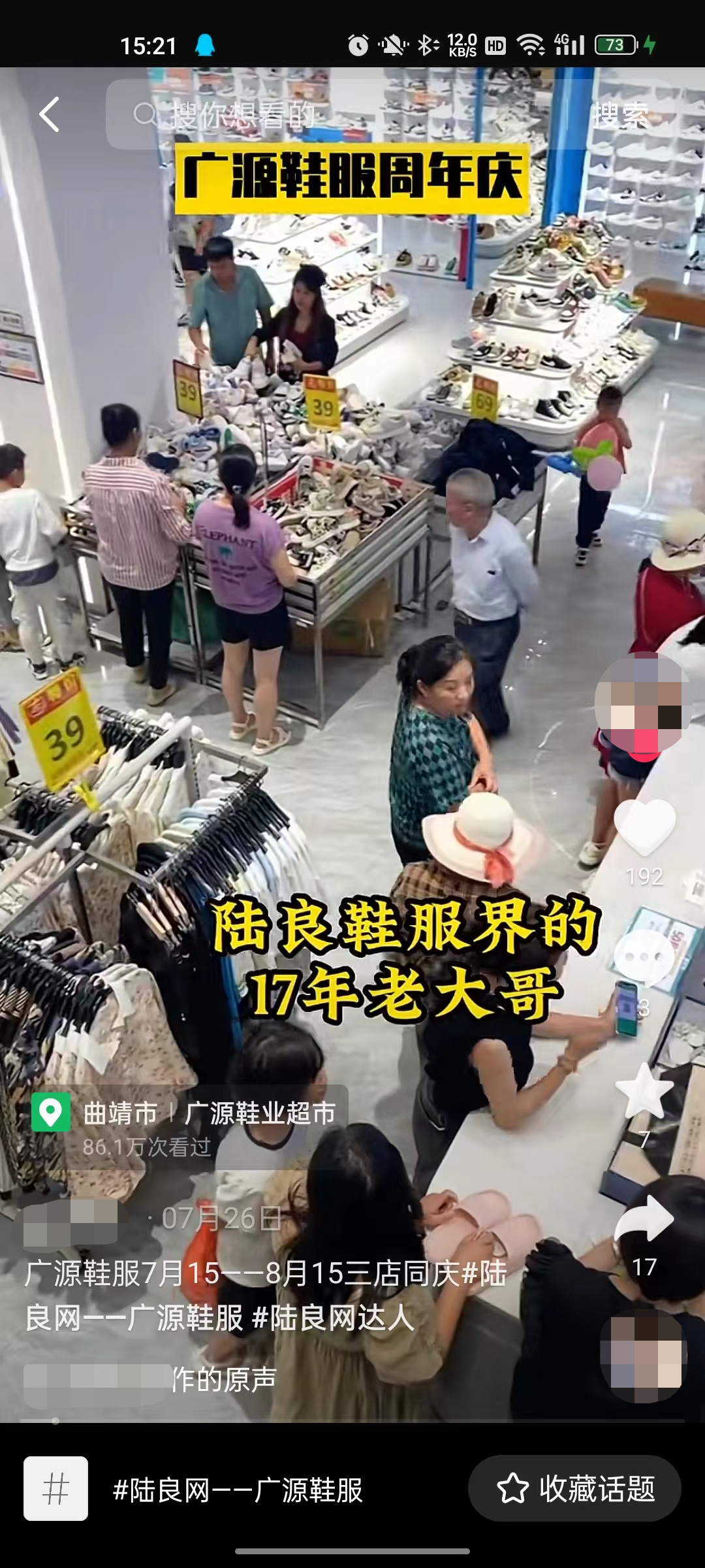 今天要分享的案例是由合作伙伴在云南省曲靖市打造的,是【鞋服】行业的商家【广源鞋业超市】,商家是当地17年的老店,店庆期间使用小魔推主要给门店做曝光。