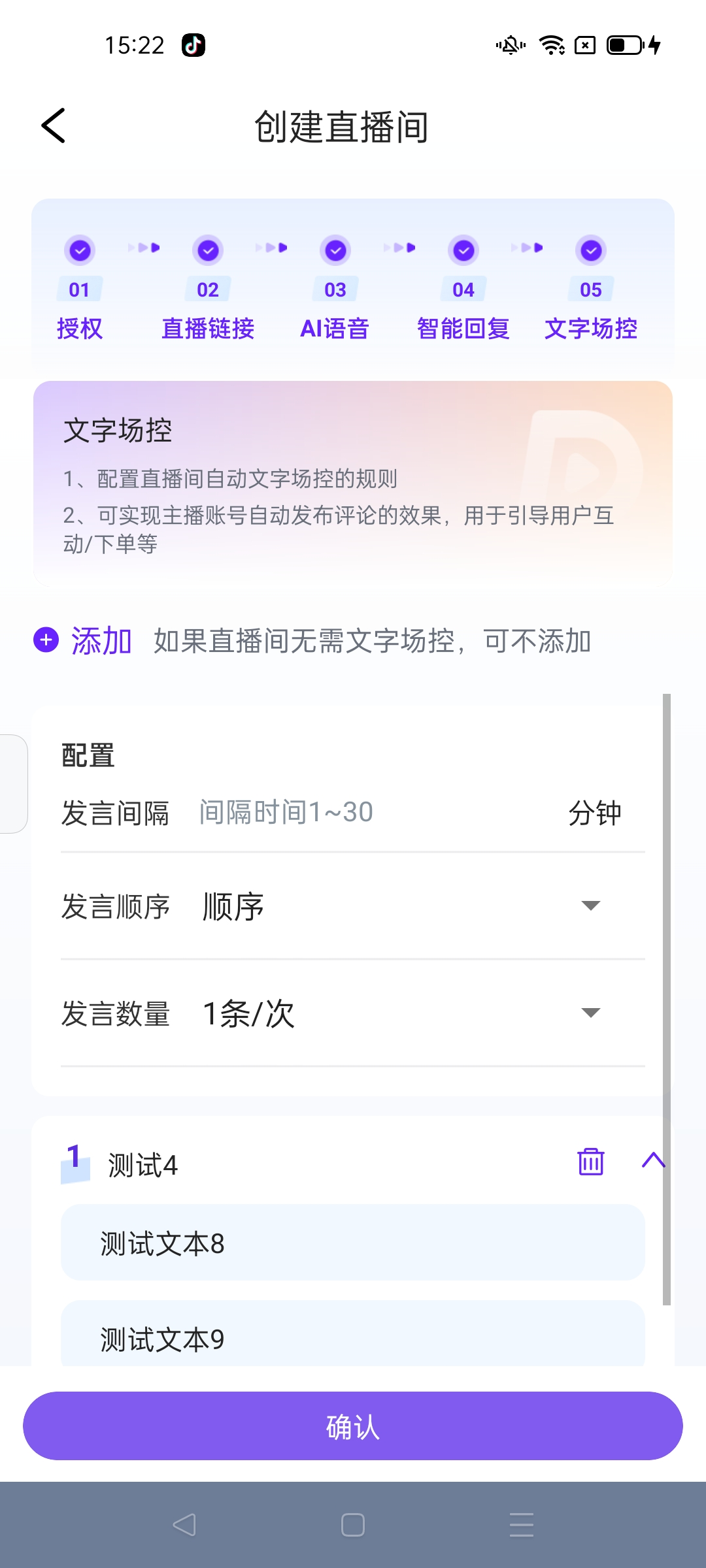 ● 文字场控功能在专业直播间使用,同样是提前配置创建场控文案,在开播时添加选择并配置发言规则即可。