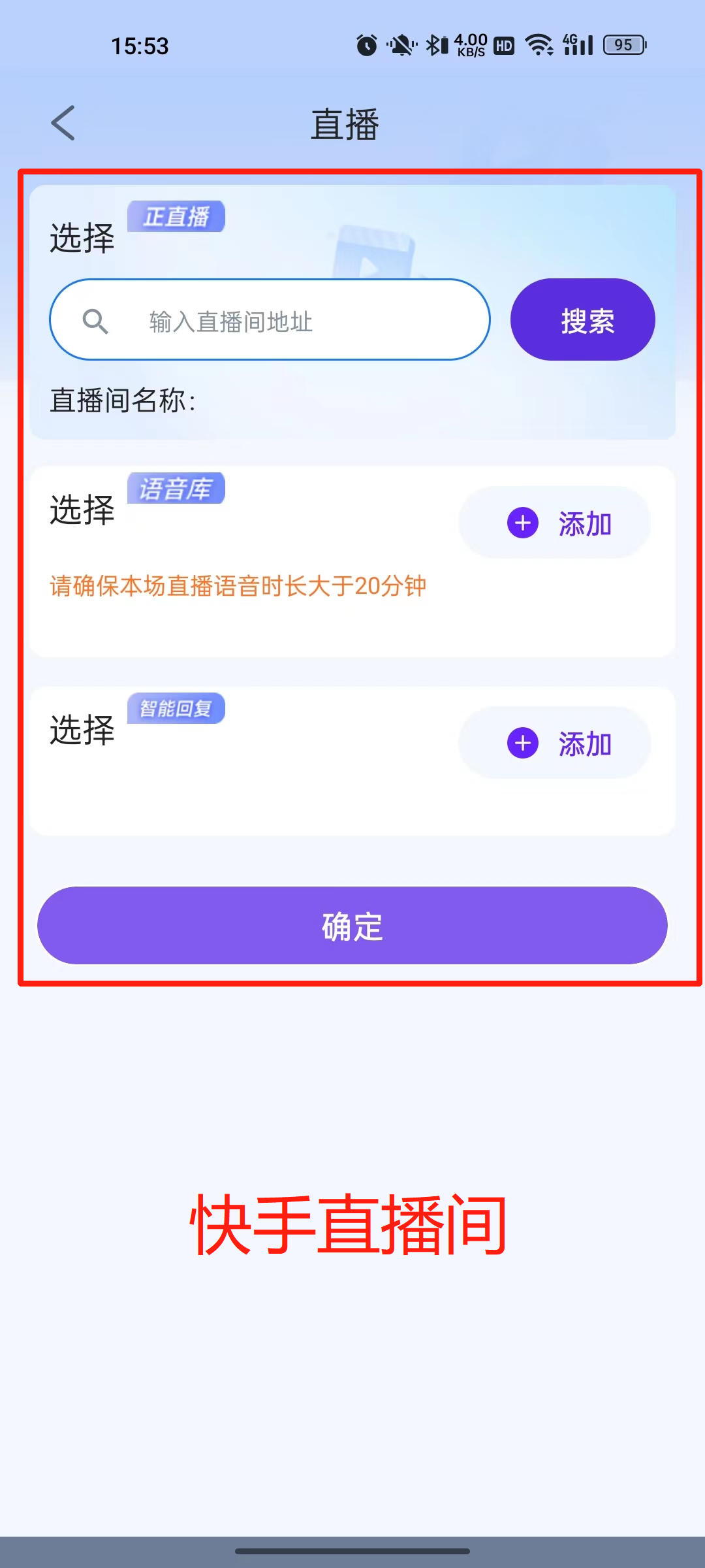 ●用快手直接创建普通直播间,输入直播间地址,选择话术库和智能回复库后就可直接开播,操作简单,适用快手平台直播。