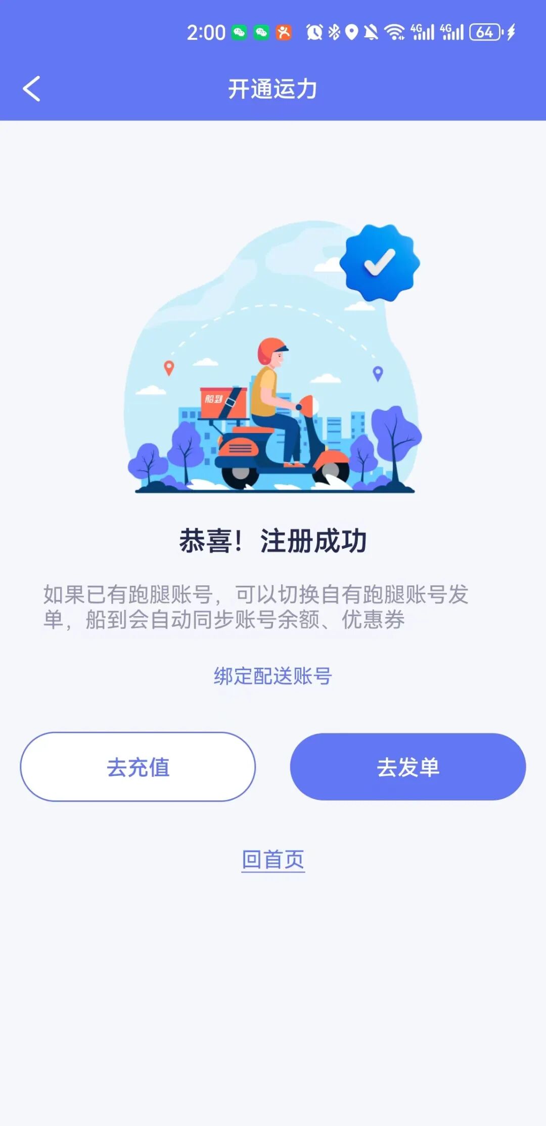 注册完成后,商家可自行选择是否需要绑定自己的跑腿账号,点击绑定配送账号即可跳转自有运力绑定界面