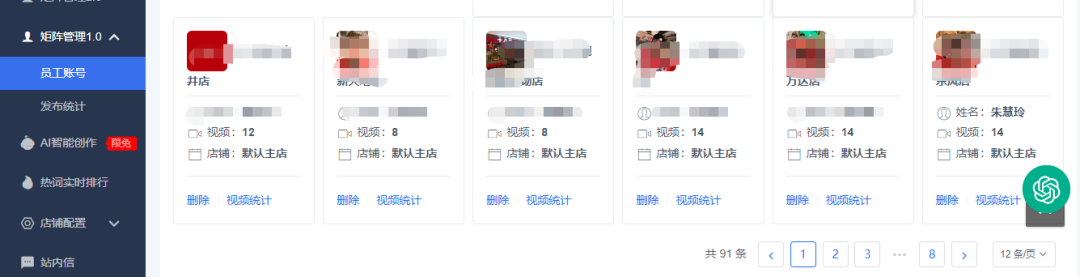 【十八碗】通过员工矩阵管理功能,旗下连锁店铺共享素材,实时发布短视频。可以在后台对录入的员工发布的数据情况清晰可查,便于统计和管理。