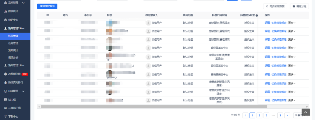矩阵账号就是各个门店+员工的账号,商家使用小魔推一共绑定了90个账号,1个人管理,每天定时定点定人发布视频,员工矩阵稳定输出,为商家品牌带来了稳定且持续的曝光!