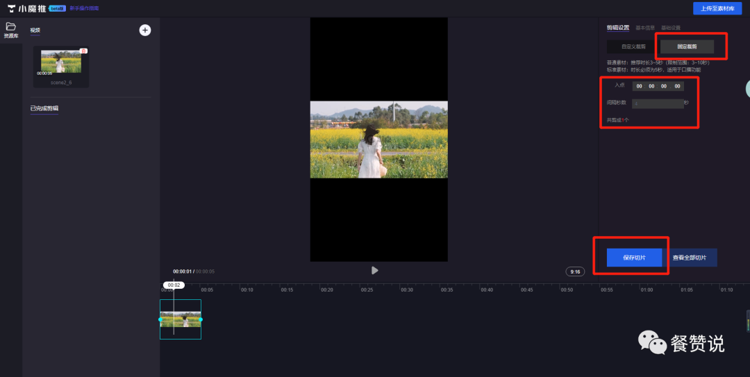 固定裁剪:设置好入点和间隔秒数,就会自动根据秒数进行多条剪辑,完成后保存切片。