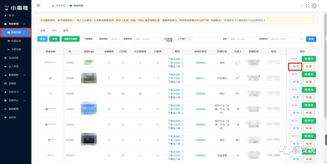 在小魔推服务商后台,【商家管理】-【商家列表】,选择好目标商家,点击【管理】。