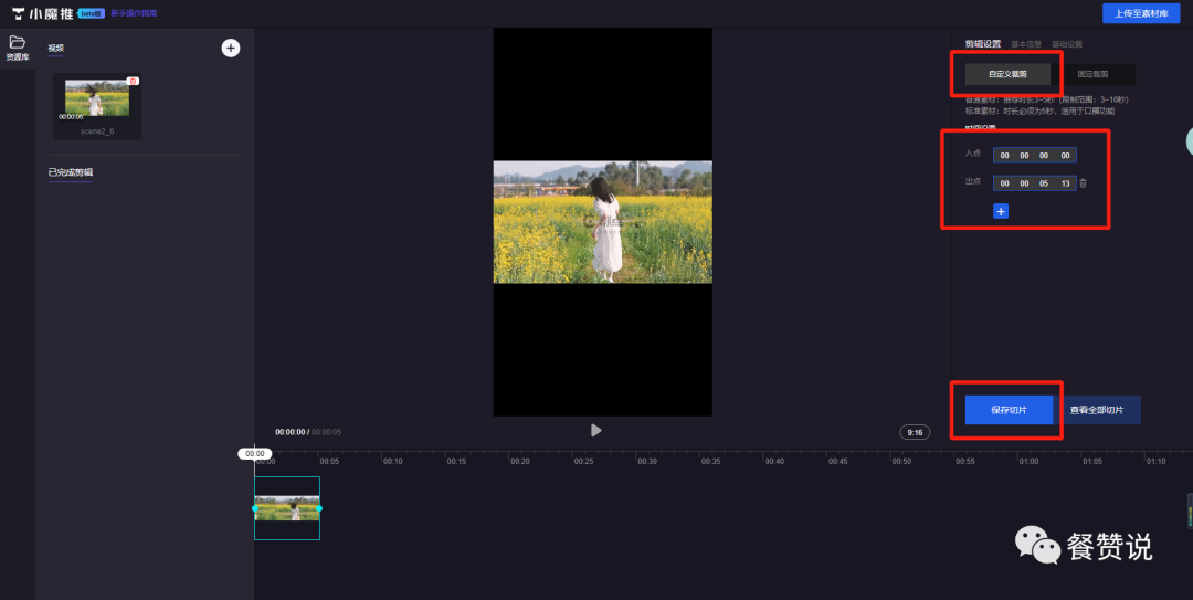 自定义裁剪:设置入点和出点,中间部分就是所需的视频,完成后保存切片。