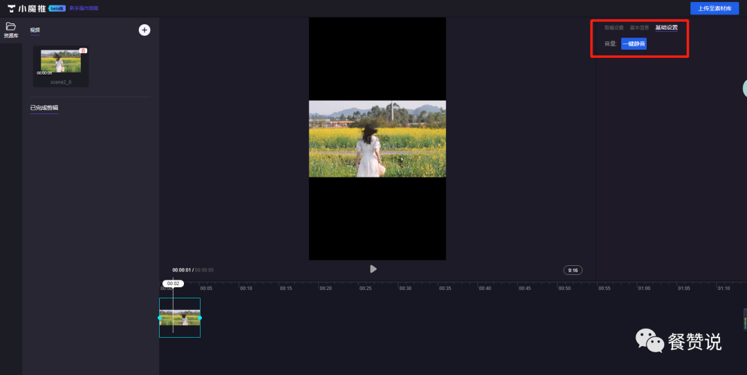 视频剪辑中,点击基础设置,即可一键静音。去除了素材的视频背景音,可以更容易地匹配视频bgm和配音。同时,也可一键恢复声音,根据素材情况和视频效果自行选择。