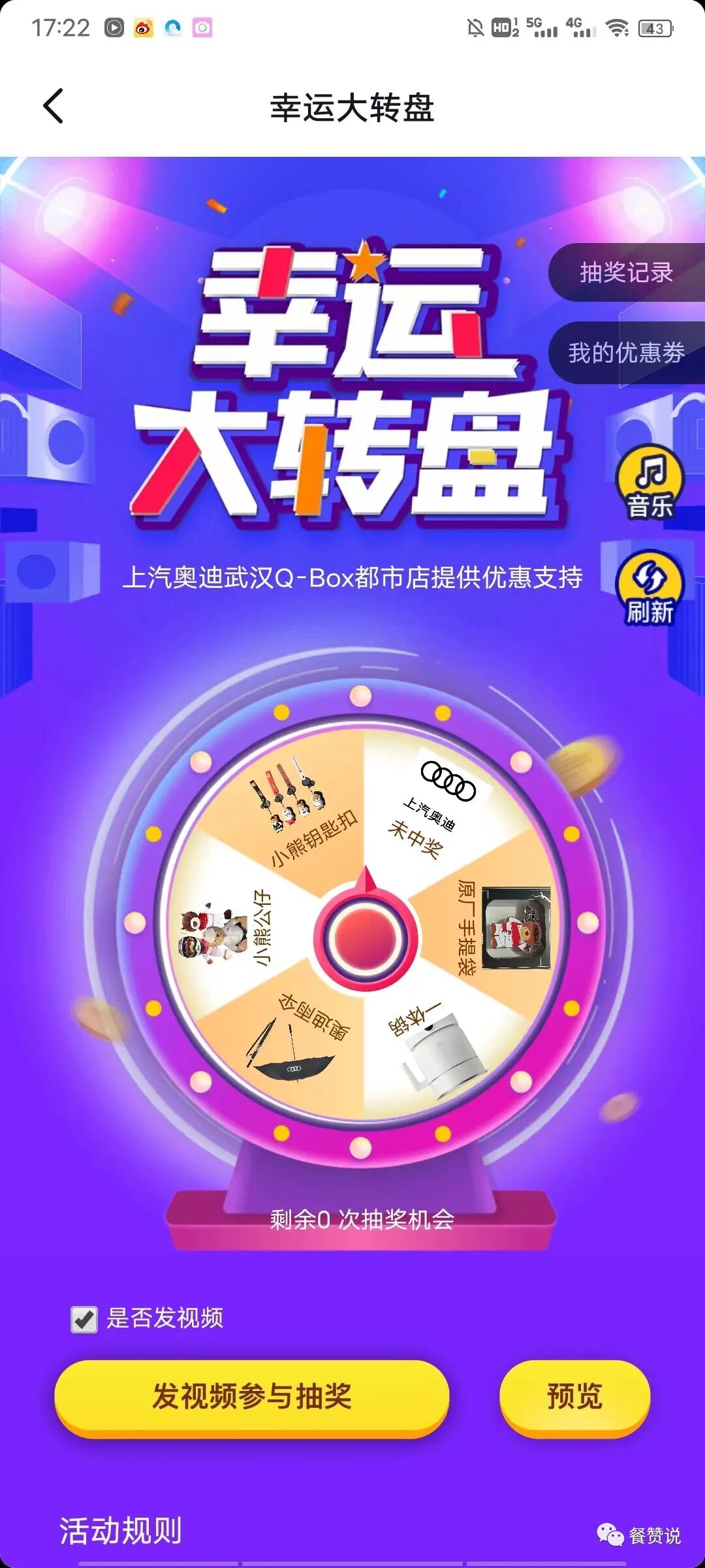 上汽奥迪的门店执行,主要由员工来进行引导,并使用了小魔推的大转盘功能,将奖品置于大转盘之中,以此来吸引用户参与扫码发视频抽大奖的活动。