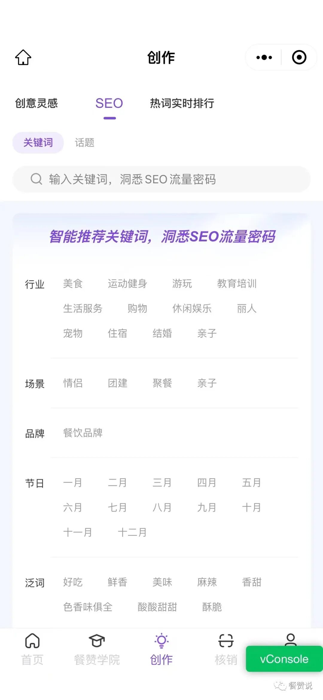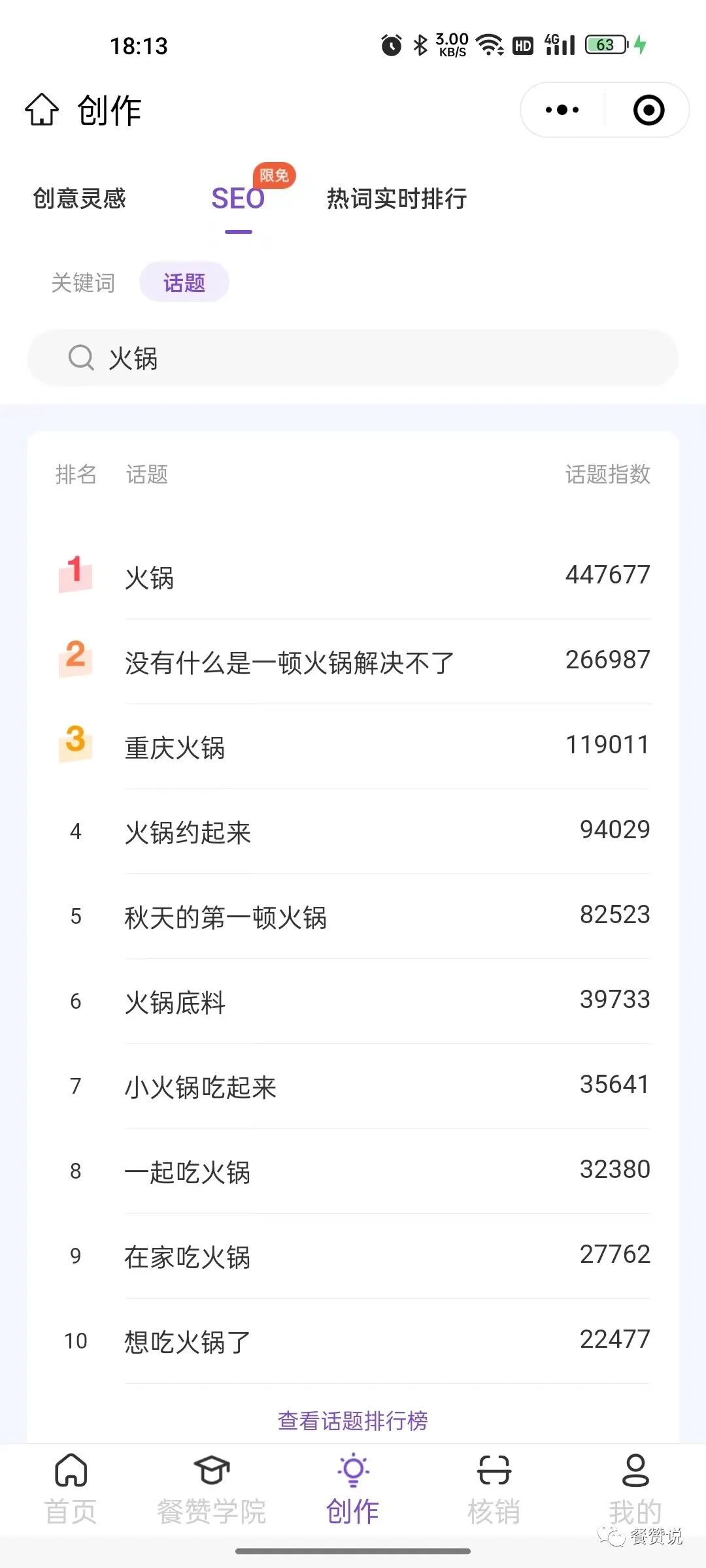 打开小魔推商家端后台,通过【创作】中的SEO可以输入关键词直接搜索,例如输入“火锅”,便可查出“火锅”这一关键词的搜索指数。