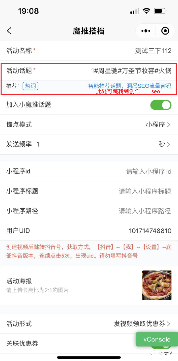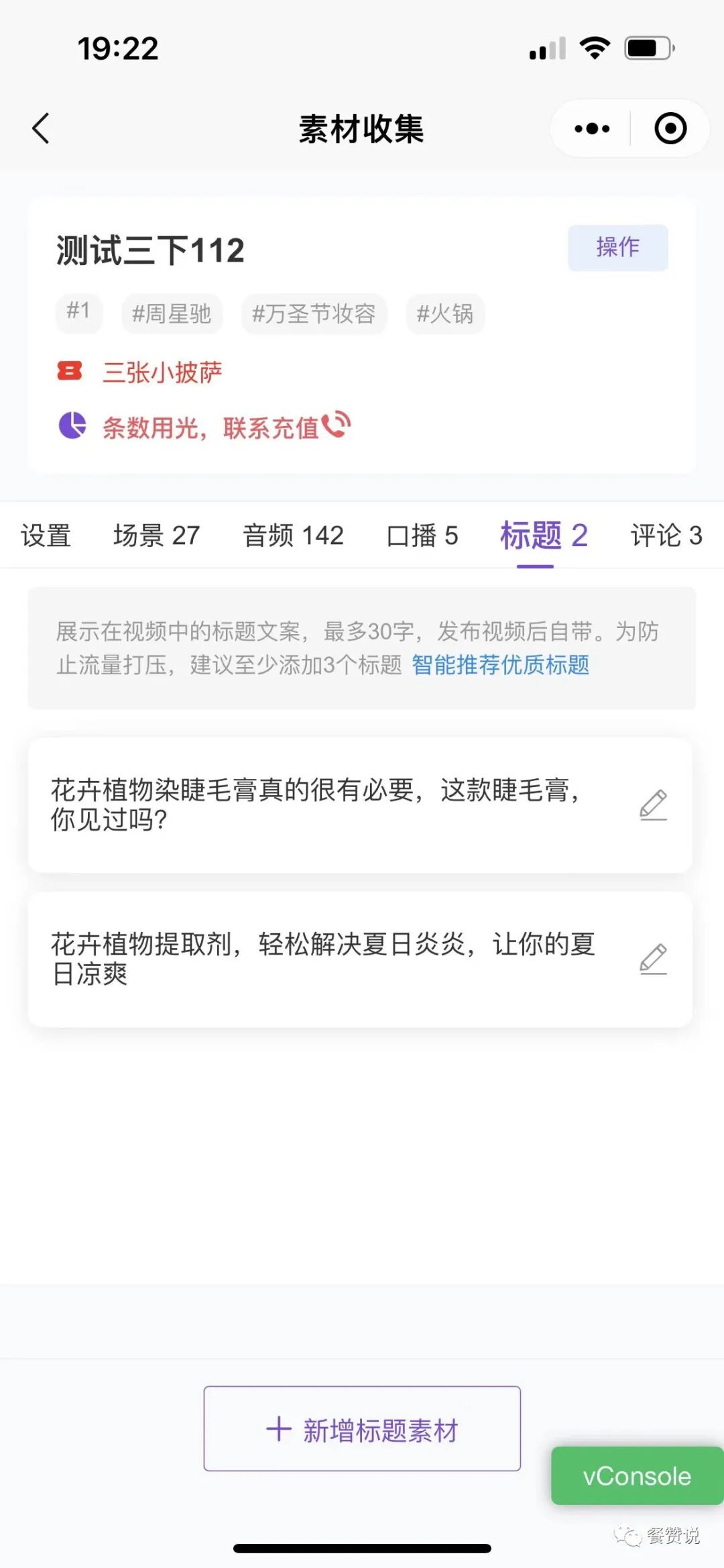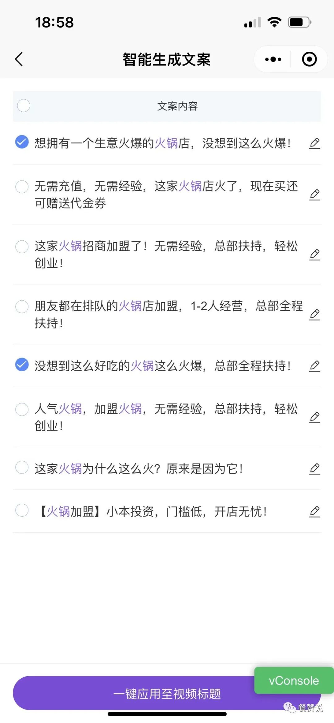 所有的预选关键词,一键即可应用到话题,在活动设置里,就会默认加上选中的关键词,同时点击智能生成文案,也会自动弹出预设的相关文案,勾选想要的文案,即可一键应用至视频标题。