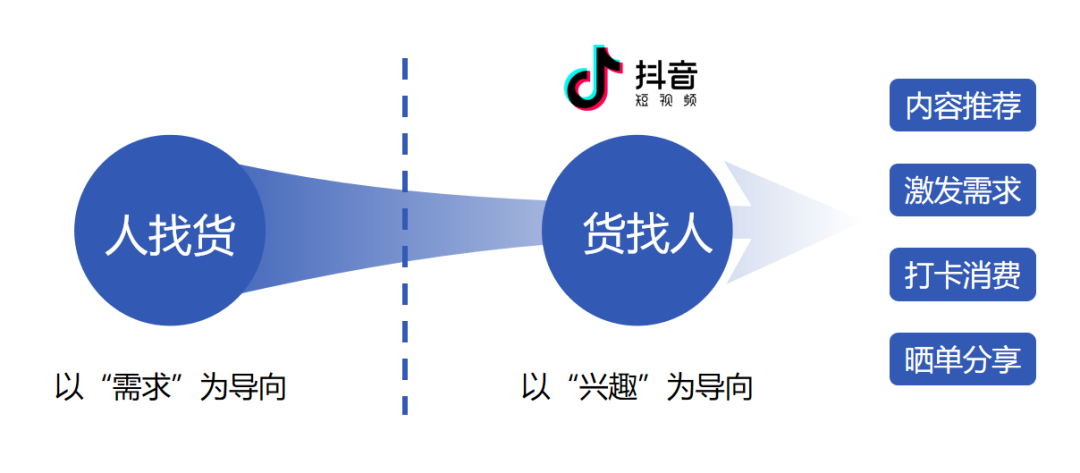 3、将传统的以“需求”为导向改变为了以“兴趣”为导向,即“人找货”变为“货找人”的模式。