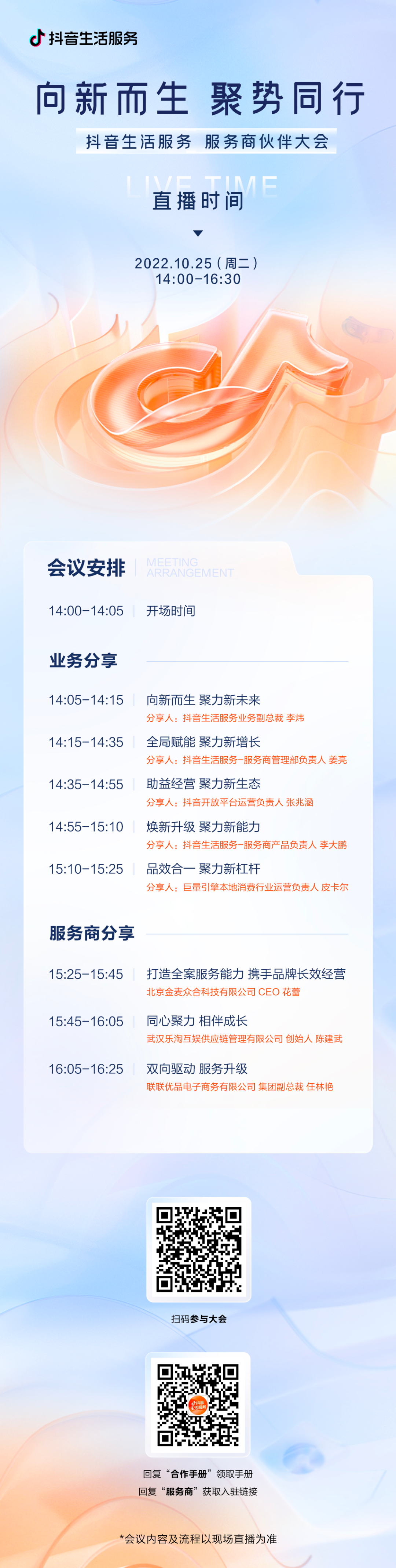 10月25日14:00,2022抖音生活服务服务商伙伴大会,期待您的参与!