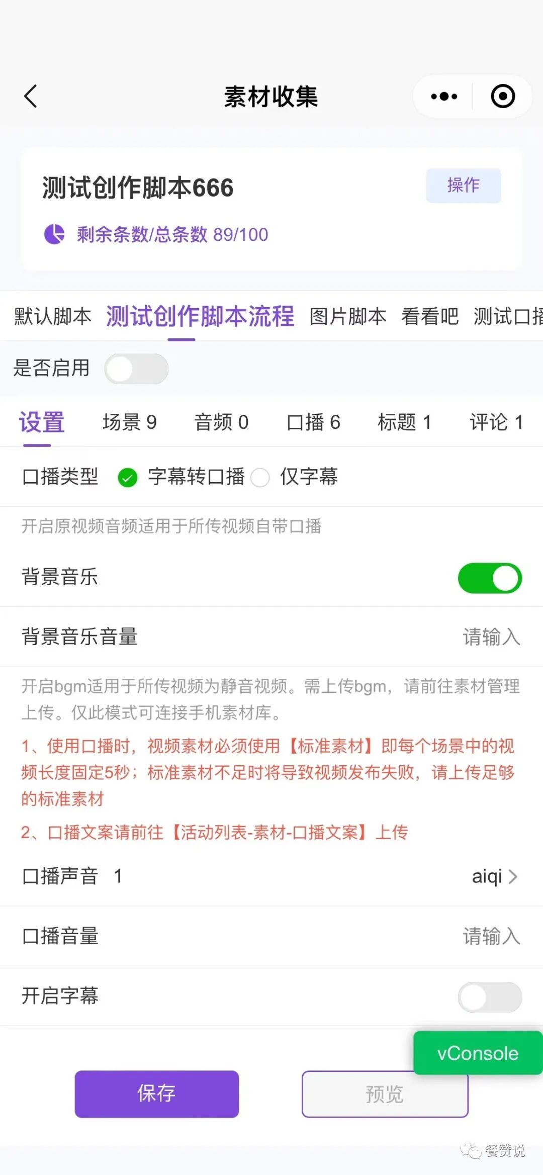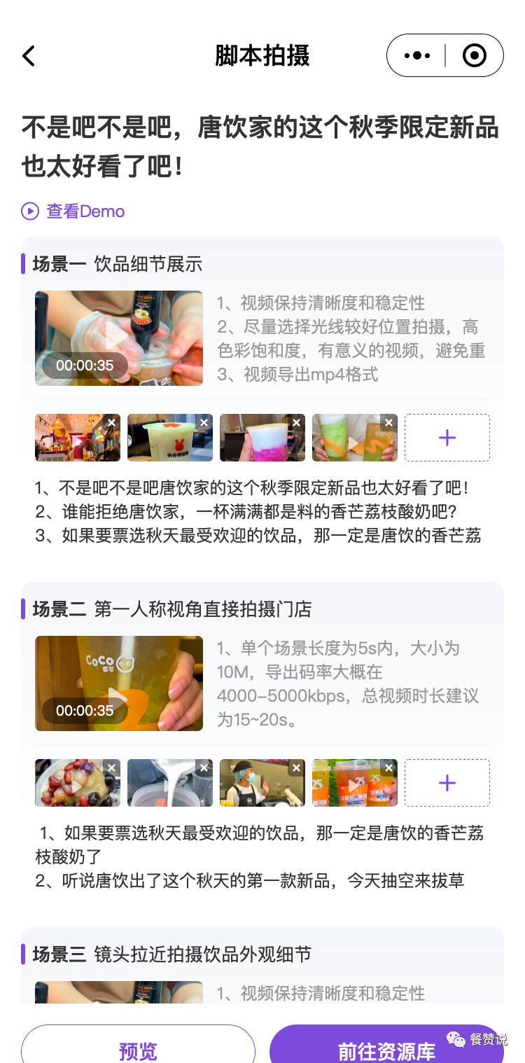 筛选脚本——使用脚本——按Demo拍摄场景素材——预览效果、裁剪、静音——进入资源库——上传至活动素材中——活动素材支持二次编辑。