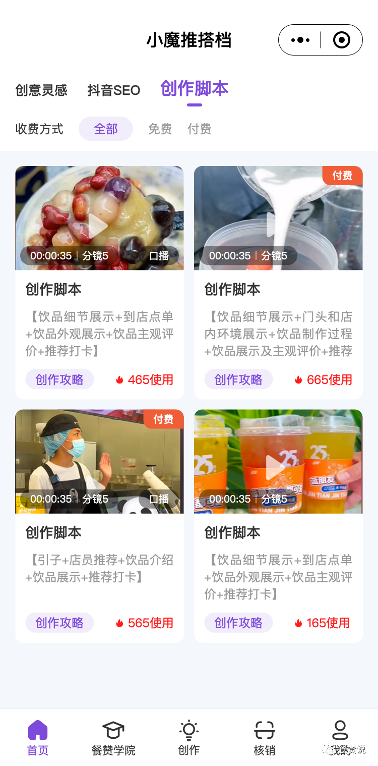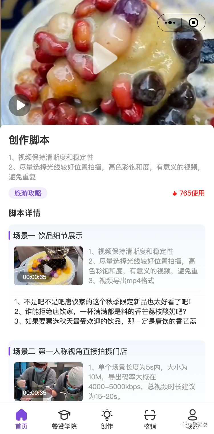 小魔推创作脚本功能就是解决商家不会视频拍摄和视频内容创作难的问题,因次该功能自带文案和拍摄指导,商家可一键应用,大大提高效率和效果。