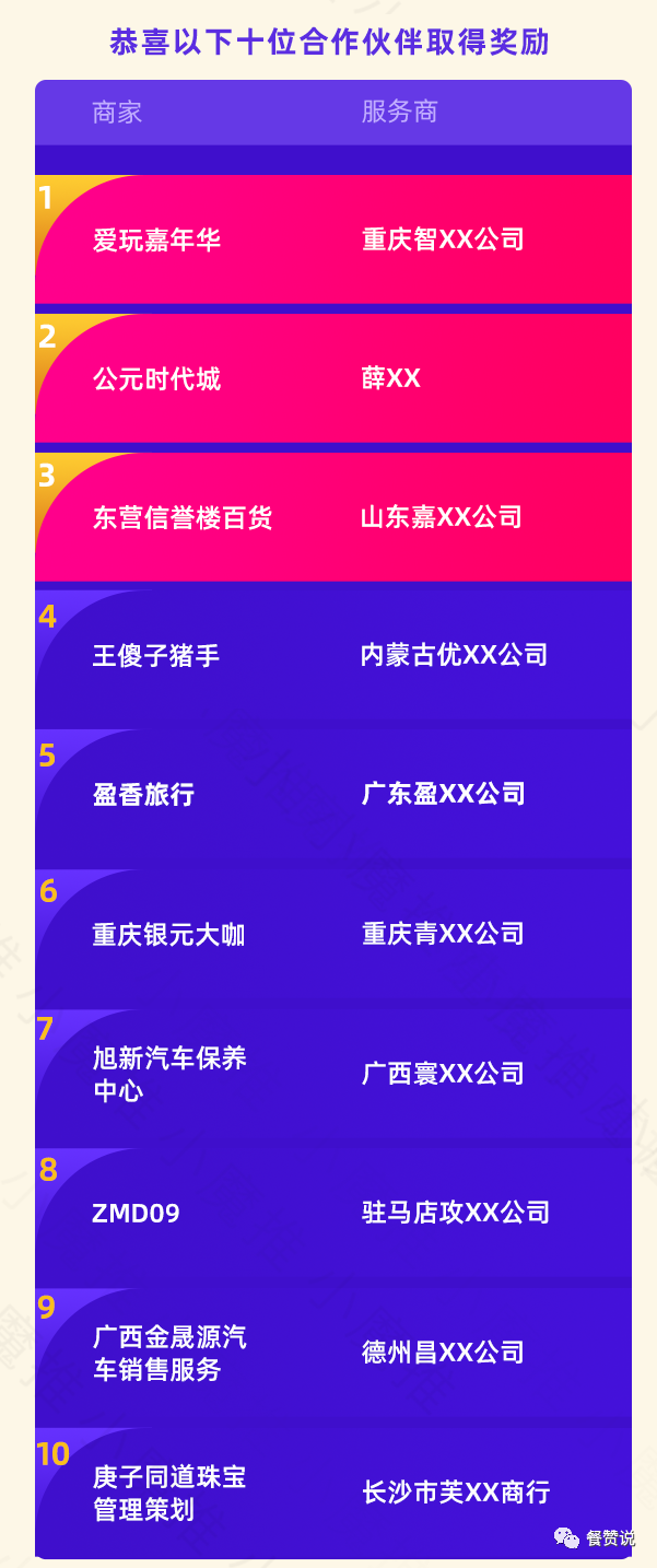 让我们掌声送给以上合作伙伴,恭喜他们取得前十名并获得了相应的奖励,奖励也已经发放到位,已给各位进行过相应的充值,大家可以查收。