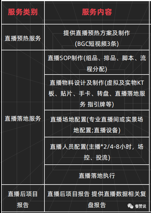 直播陪跑服务的类别涵盖了直播预热、直播落地以及直播后项目报告全流程。