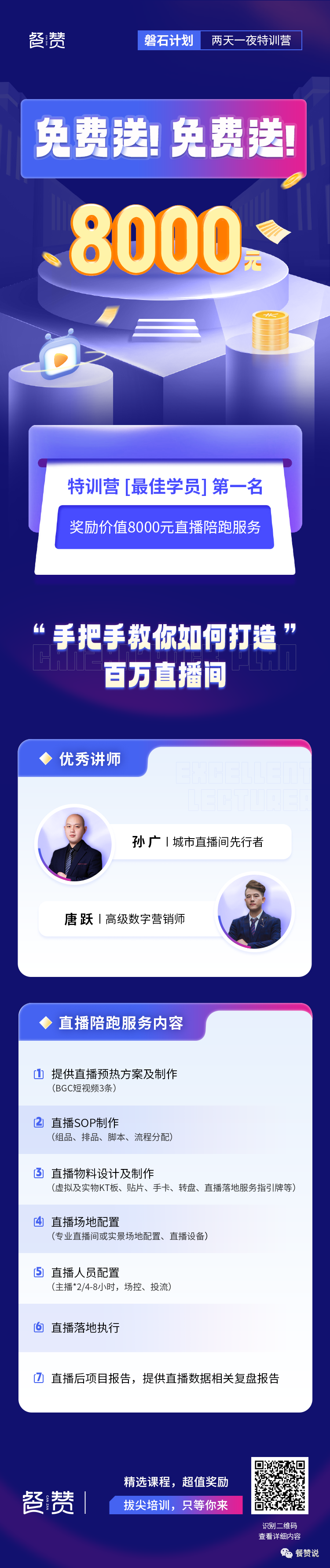 餐赞磐石计划两天一夜特训营开营在即,现在报名还有机会,参与集训提高直播运营能力,把握直播风口机会,下一个时代弄潮儿就是你!