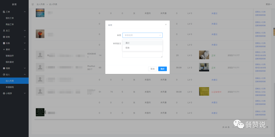 通过不同条件筛选满足需求的优质达人,运营者可在后台查看达人的账号数据以及任务完成情况,审核达人的入驻信息,达人数据清晰展示,方便分层管理。