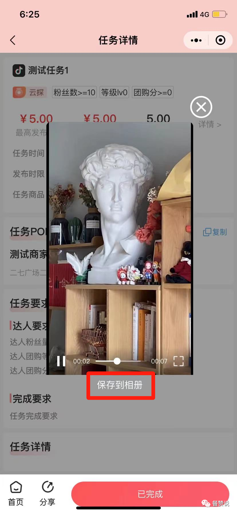 达人承接任务可下载视频发布至其他平台,满足更多推广需求。不仅能够实现短视频扫码直接发布,还可以将视频素材保存至本地相册,支持达人素材下载自创作,满足达人不同风格的发布需求。