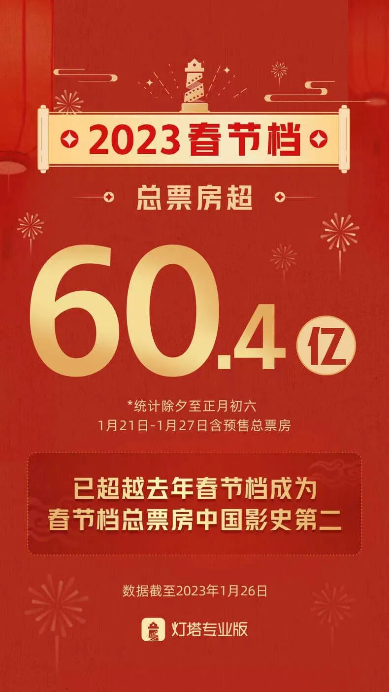 据灯塔专业版数据,截至27日晚8点,2023年春节档总票房已经突破67亿元,超过去年,仅次于2021年,位列中国影史春节档电影票房第二位。数据显示:2023年1月22日,全国有票房收入的影院共有11544家,数量上恢复至去年同期的98%,今年春节档上座率明显提升,截至1月27日15时,2023年春节档场均人次达47.1人次,较2022年春节档每场提升了10人次以上。专家表示:“现在营业的10000多家电影院,通过春节档得到了补血和输血。估计后春节档也会有非常抢眼的表现,从初八到正月十五,甚至到整个正月,观影热情还会不断释放。(央视财经)