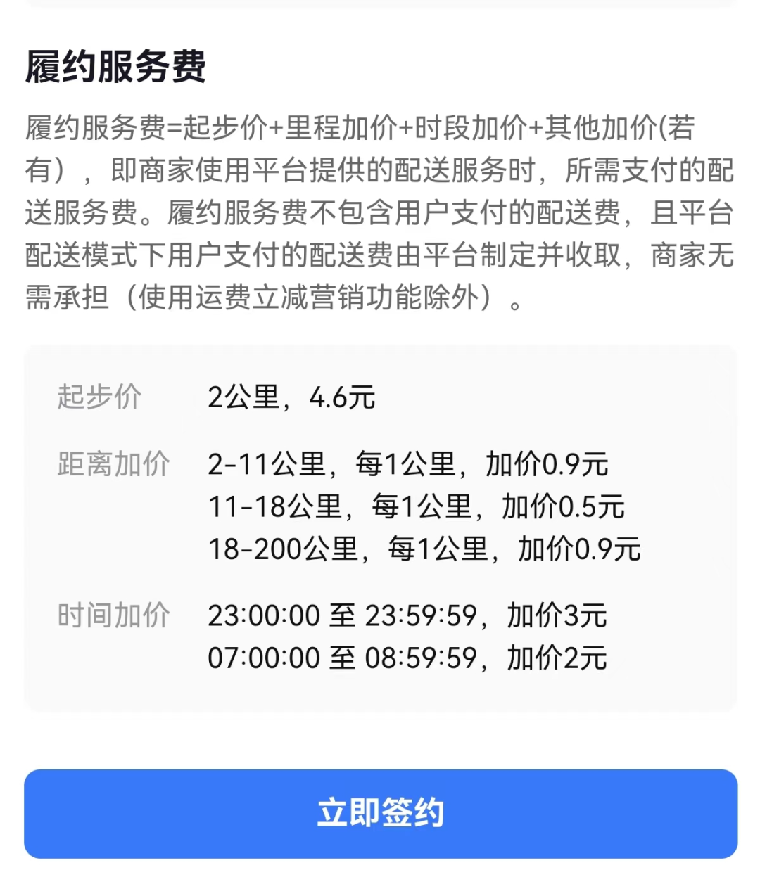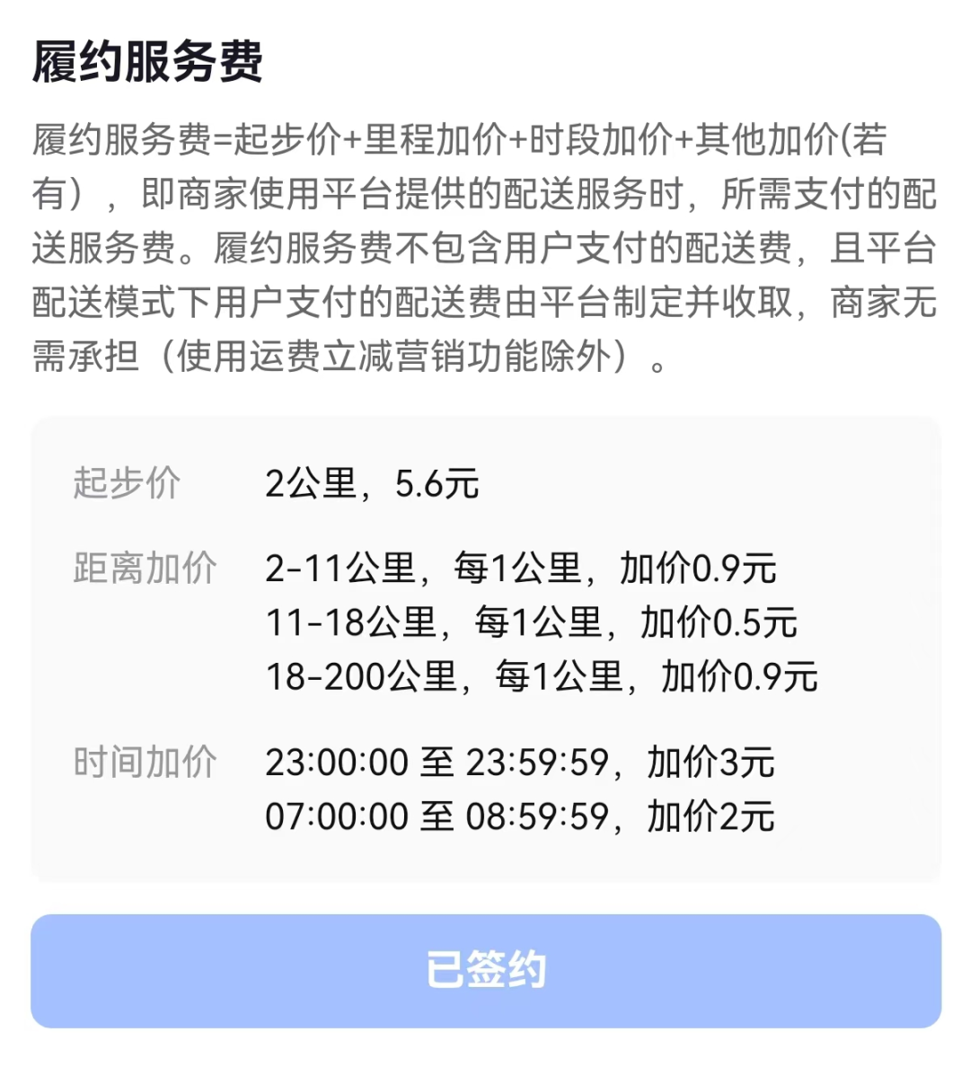 履约服务费计算方式为起步价+里程加价+其他加价(若有),即商家使用平台提供的配送服务时,所需支付的配送服务费。