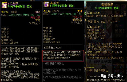 先说装备基础属性,两件(套)装备的差异很明显,大军神套主打伤害词条,词条总和为186%,其中有41%技攻;而小军神套(时间战争)词条总和为187%,其中有41%技攻,以及12%冷却缩减。