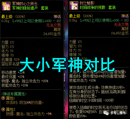 地下城中有一种神话叫“军神”,不管男女老少都听闻过它的大名;同时还有另外一种神话叫“小军神”(时之魅影),顾名思义也是得到了军神的部分传承,虽然名字有大小之分,但属性却未必真的低人一等,那么这两件神话究竟孰优孰劣呢?这里咱们来做个简单对比。
