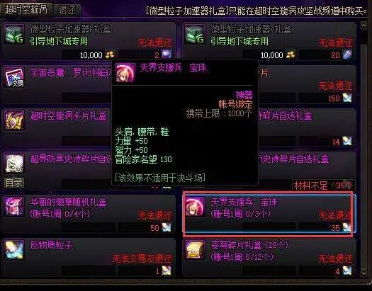 我们这里推荐搬砖兑换是【天界支援兵 宝珠】,力智+50,可同时满足头肩、腰带、鞋的附魔,一周可兑换3次。35个反物质粒子兑换1个宝珠,兑换3个共需要35*3=105个反物质粒子。